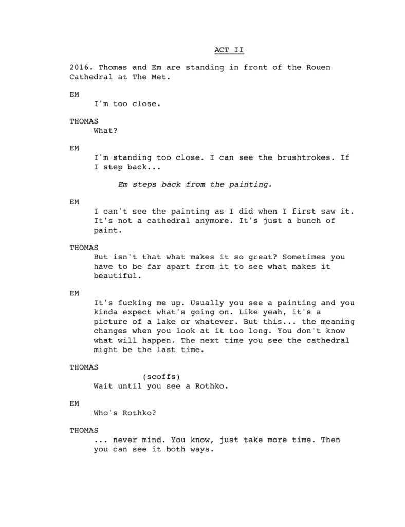 Closing this blog post, I want to show you an excerpt of a play I’ve been working on this past year. This scene below is mostly inspired by Monet and “The Circle Game” (with a cheeky reference to Phoebe Bridgers’ “ICU”).